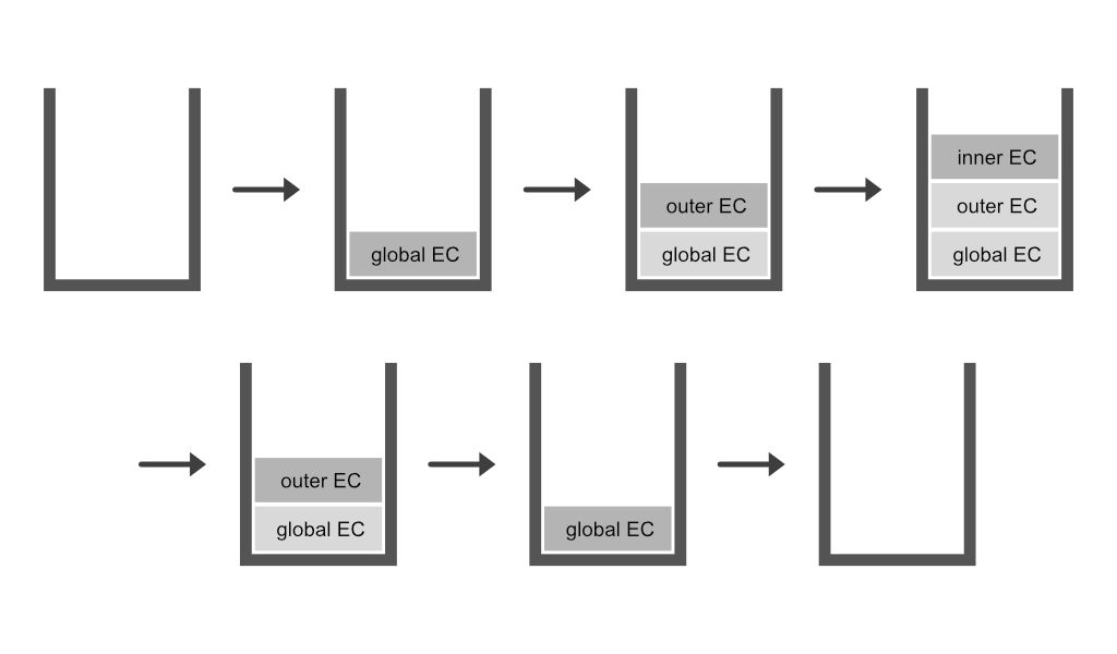 위 예제의 실행 과정을 보면 최초 자바스크립트 코드를 실행하는 순간 전역 컨텍스트가 생성 될 것이고(최상단의 공간은 코드 내부에서 별도의 실행 없이 브라우저에서 자동으로 실행되므로, 자바스크립트 파일이 열리는 순간 전역 컨텍스트가 활성된다고 이해하면 좋습니다), outer함수가 실행되며 outer에 대한 실행 컨텍스트가 생성되고, 최종적으로 outer내 inner함수가 실행되며 것 inner에 대한 실행 컨텍스트가 생성 될 것 입니다.