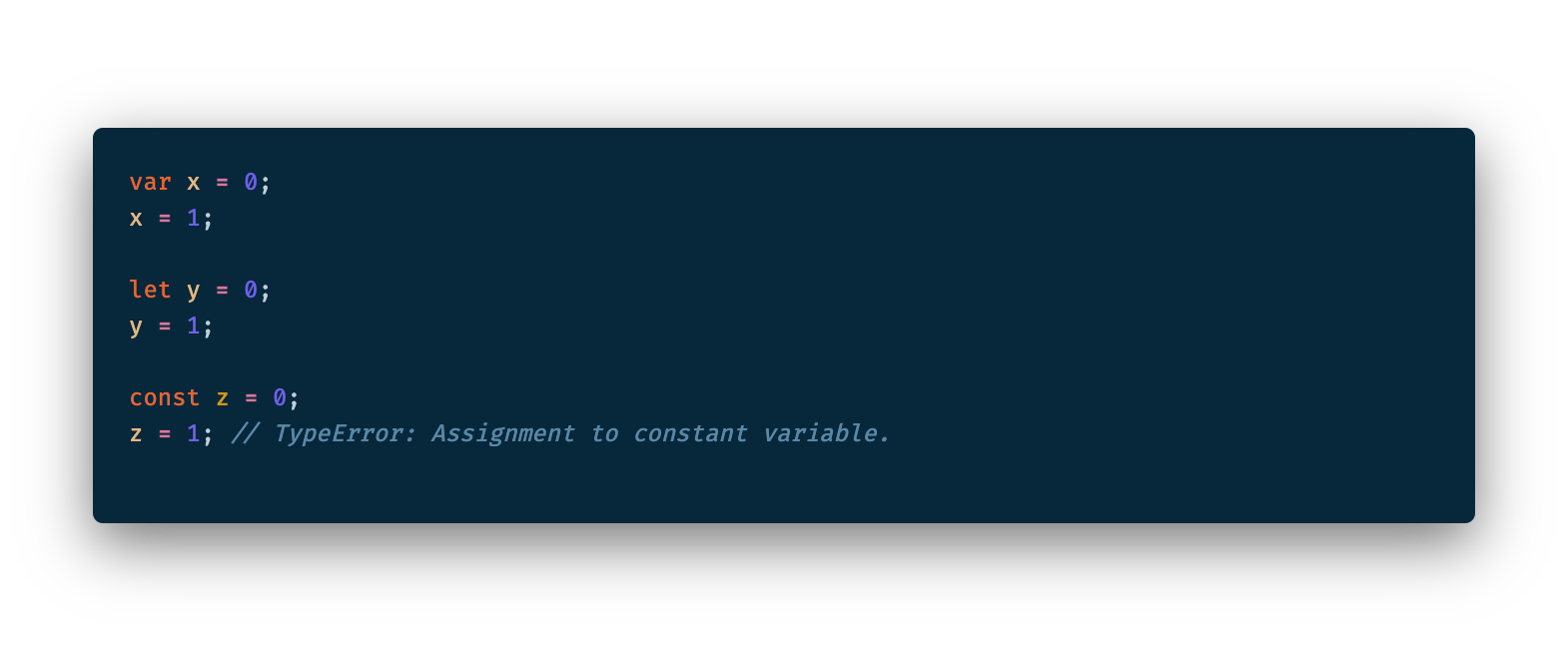 var 또는 let 키워드로 선언한 변수는 재할당이 자유롭지만, const로 선언한 변수는 재할당 할 수 없습니다.