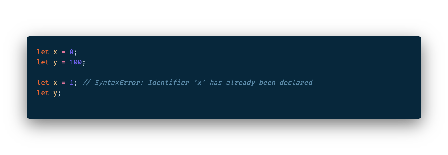 반면 let, const 키워드로 선언 한 변수는 같은 스코프 내에서 중복 선언을 허용하지 않습니다.